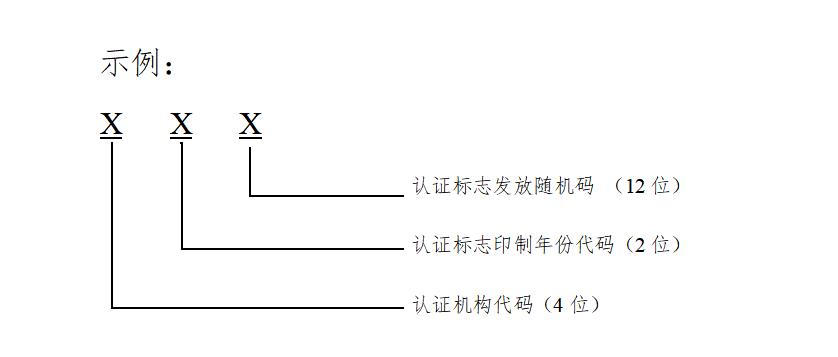 該代碼是認(rèn)證機(jī)構(gòu)發(fā)放認(rèn)證標(biāo)志數(shù)量的12位阿拉伯?dāng)?shù)字隨機(jī)號碼。數(shù)字產(chǎn)生的隨機(jī)規(guī)則由各認(rèn)證機(jī)構(gòu)自行制定。